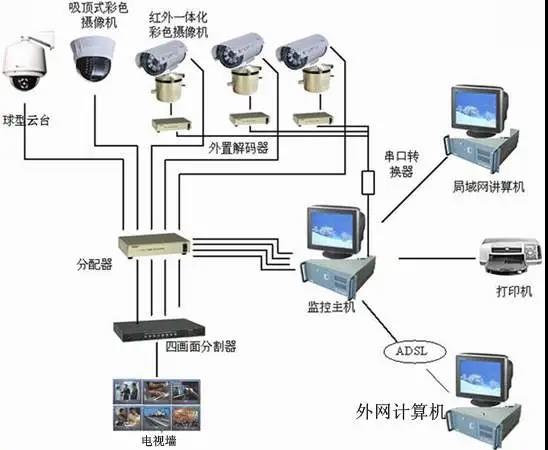 通過安裝在現場的攝像機、防盜探測器等設備,對建筑物的各出入口和一些重要場所進行監視和異常情況報警等;視頻信號的傳輸采用星型結構,使用視頻同軸電纜;控制信號的傳輸采用總線結構,使用銅芯絕緣纜線。